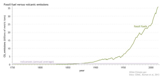 It's Not Volcanoes:There's just no question about it, the amount of CO2 emitted by volcanic eruptions over the last few centuries is about 1/60th of human emissions Here's another source on the subject What we usually experience in big volcanic eruptions is that, for only a few hours, their greenhouse gas emissions rival those of the human race, but then the eruption ends. Usually, they emit a tremendous amount of ash into the atmosphere, and the ash particles reflect the sun, with a net colling effect. Some people just claim, off the top of their heads, that scientists aren't counting undersea volcanoes, which is hogwash. The human race has been operating a network of seismometers covering the whole planet for many decades, and any time there's a volcano, on land or under sea, our geologists know all about it. Also, even if they weren't taking undersea volcanoes into account, the area of ocean is about 2.5X the area of land, so if 1/60th of emissions are from land-based volcanoes, then it stands to reason that 2.5/60 of emissions are from undersea volcanoes, which is still not significant. And we've had a huge increase in atmospheric CO2 concentration in the last 200 years, just at the time we began burning fossil fuels. Is anyone seriously claiming that there has been a tremendous increase in volcanic activity at exactly the same time? |