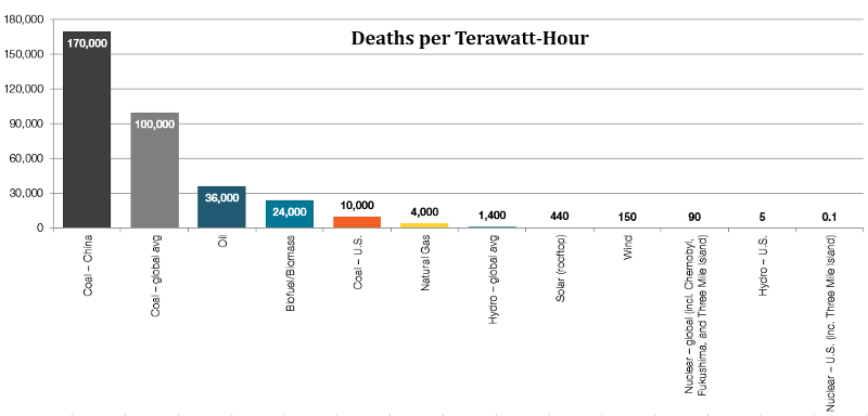 Some people may feel that the statistics above on nuclear are unexpectedly low, given the accidents at Chernobyl and Fukushima. The World Health Organization estimates 4,000 deaths, including cancers, from Chernobyl, and there were one or two thousand deaths from the hasty and unnecessesary evacuation of the area around Fukushima. No one died at Three Mile Island. So that's something like 6,000 deaths, and bear in mind that the statistics are deaths per unit amount of energy, and the human race has obtained an absolutely huge amount of energy from nuclear power by this point. The real tragedy of Fukushima is that Germany shut down a number of nuclear plants in reaction to it, burned very dirty, high-pollution coal to replace the energy, and the pollution from that coal combustion has killed far more Germans than the number of Japanese who died in the evacuation from Fukushima. Its so common for thousands of people to die from coal pollution that it doesn't make the news. If anyone dies from radiation, it's world headlines. It should be noted that the Chernobyl plant was just horribly unsafe by American standards, having no containment vessel and other flaws. There is no expectation that anybody, anywhere in the world, will build a plant anywhere near that unsafe in the future, so the future global death rate from nuclear should be far below the past death rate. Chernobyl did expose a lot of people to a lot of radiation, but far fewer of them got sick than was expected. So one of the lessons of Chernobyl is that radiation is less dangerous than was previously supposed. |